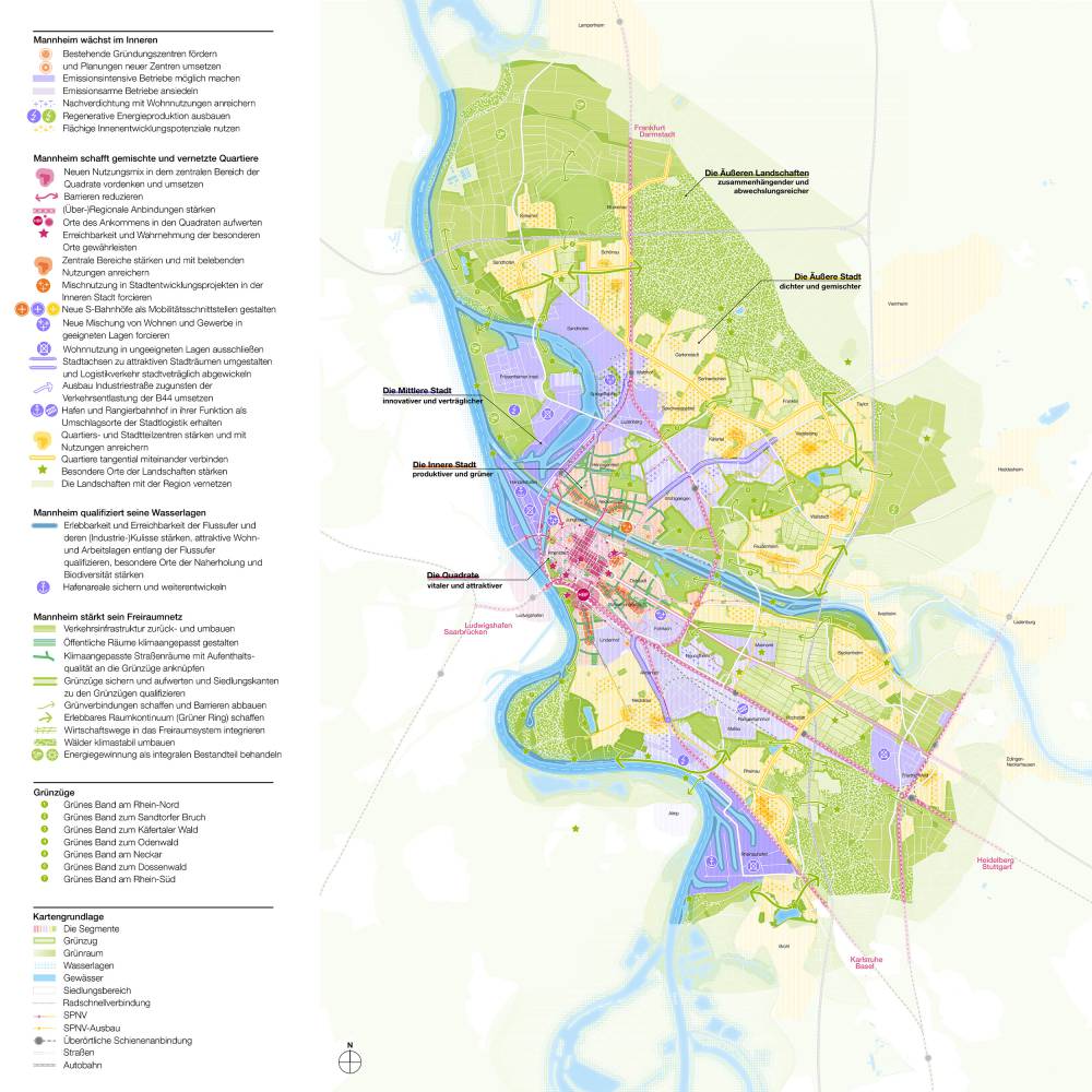 Für das Mannheimer Stadtgebiet wurden fünf modellhafte Stadtsegmente identifiziert. Diese Stadtsegmente sind Funktionsbereiche mit ähnlichen räumlich-strukturellen Herausforderungen und Potenzialen. In den fünf Stadtsegmenten verbinden sich mit den vier Querschnittsthemen spezifische Entwicklungschancen. Typische Potenziale der räumlichen Stadtentwicklung werden je Stadtsegment benannt und auch kartografisch verortet.