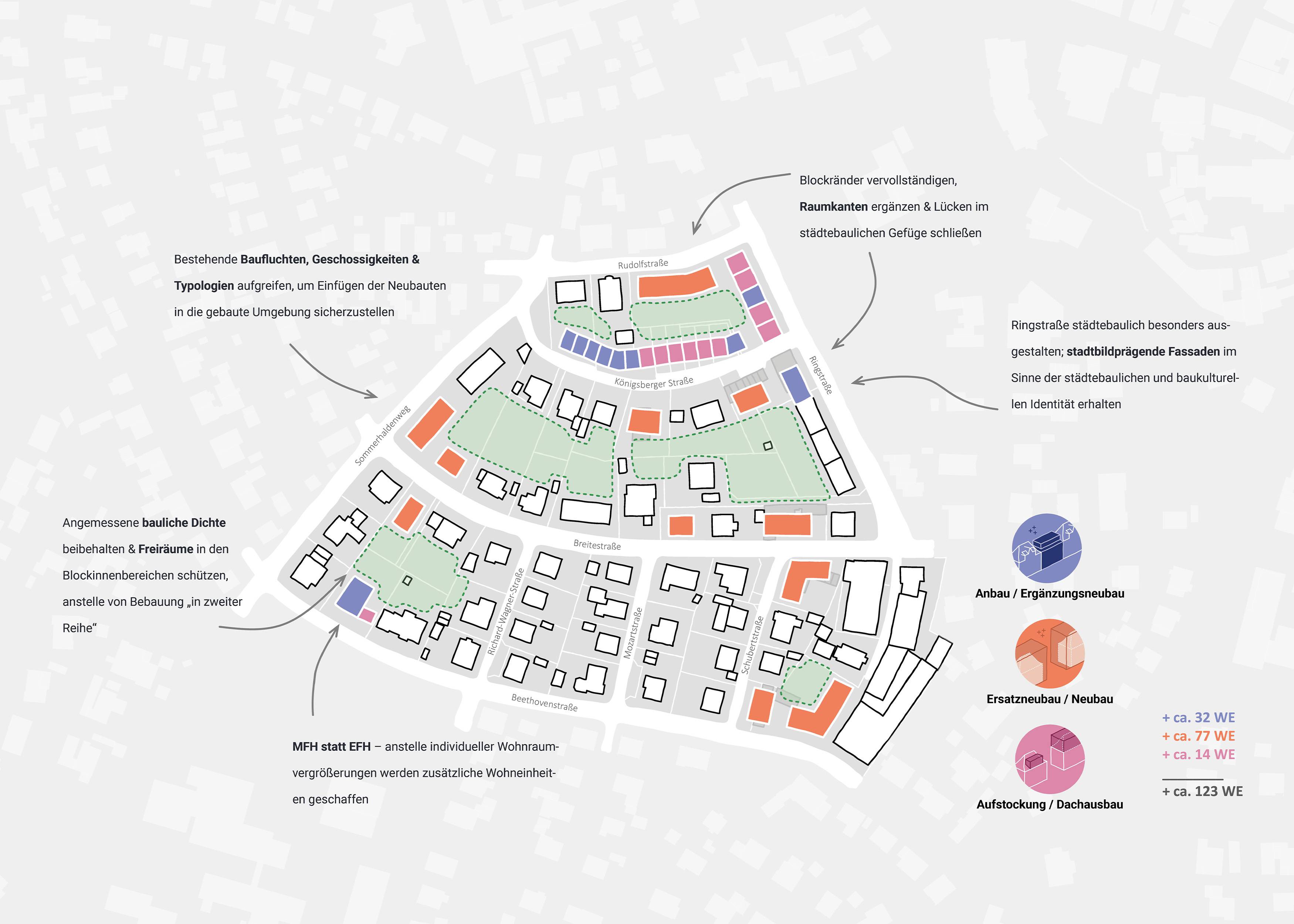 Mithilfe von Testentwürfe wurden auf ausgewählten Potenzialflächen verschiedene Nachverdichtungsszenarien durchgespielt und ihre Auswirkungen auf die Umgebung getestet. Dabei standen nicht nur die quantitative Erhöhung der Wohneinheiten, sondern auch eine qualitative Verbesserung des direkten Wohnumfeldes qualitativ im Fokus. Die Testentwürfe sollen positive Perspektiven aufzeigen und veranschaulichen, wie Nachverdichtung zu einer nachhaltigen Stadtentwicklung beitragen kann.