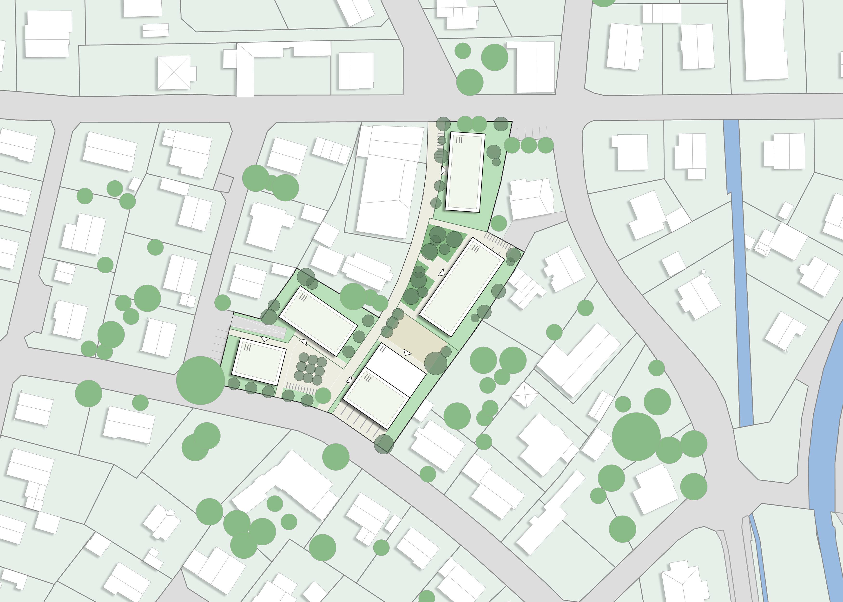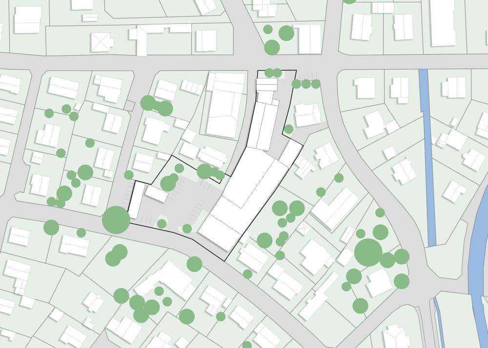 Das Beispiel beleuchtet die Umnutzung einer gewerblich genutzten Fläche im Wohnumfeld. Der Testentwurf zeigt, wie durch eine Neuordnung des Grundstücks eine flächeneffiziente Wohnbebauung bei gleichzeitiger Rückgewinnung neuer Grün- und Freiräume funktionieren kann. Die Varianten zeichnen dabei verschiedene Szenarien von einer eher lockeren Bebauungsstruktur mit einem Zugewinn von ca. 25 Wohneinheiten bis zu einer Bebauung mit Mehrfamilienhaus-Typologien mit ca. 40 zusätzlichen Wohneinheiten.