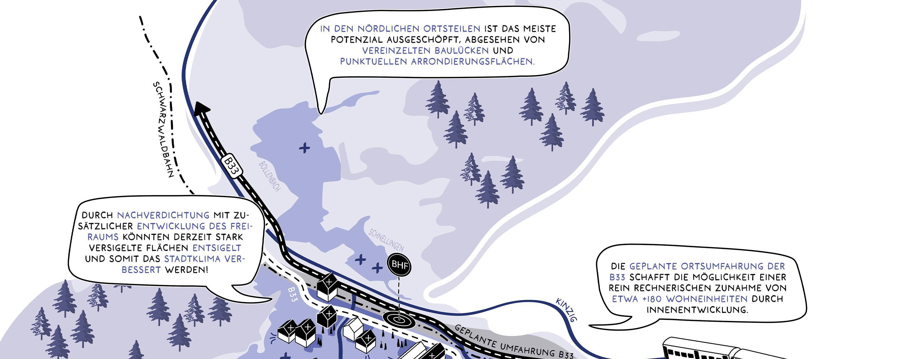 Die Erhebung der Wohnraumpotentiale basierte auf einer teil-automatisierten Analyse der Flächenausnutzung in Kombination mit Vor-Ort-Begehung. In einem iterativen Prozess in Abstimmung mit der Stadt Haslach wurden den ermittelten Potenzialen konkrete flurstücks- oder siedlungsbezogener Potenzialtypen zugewiesen. Der finale Flächenpool stellt auf Basis der festgelegten Methodiken, die erhobenen Innenentwicklungspotenziale der Stadt dar.