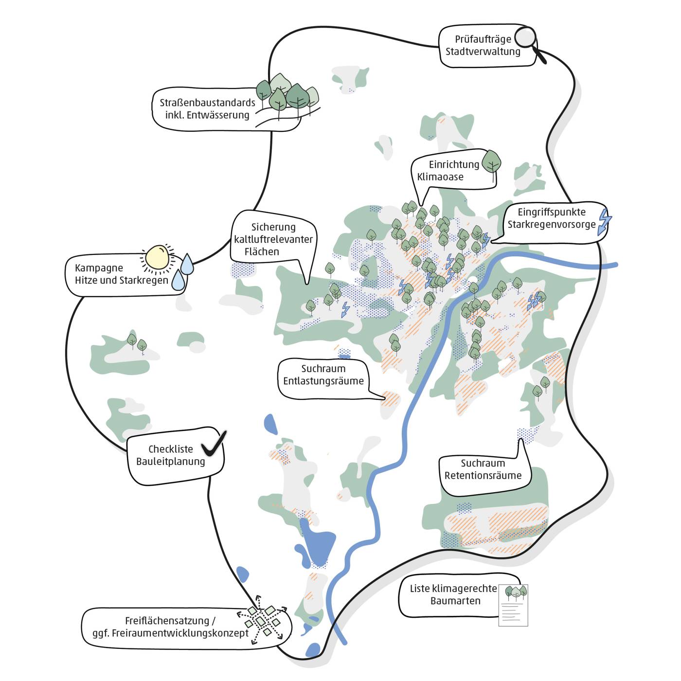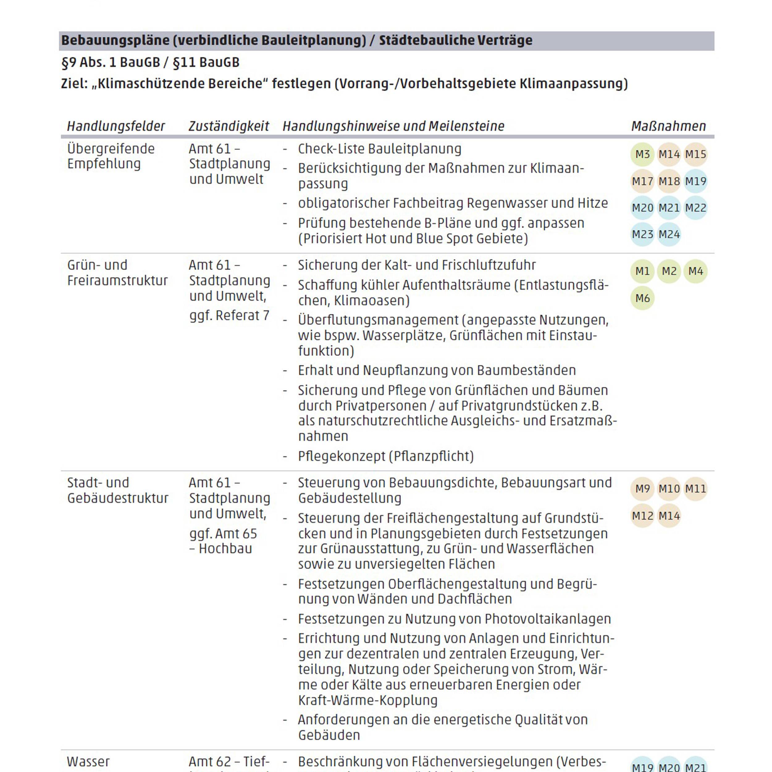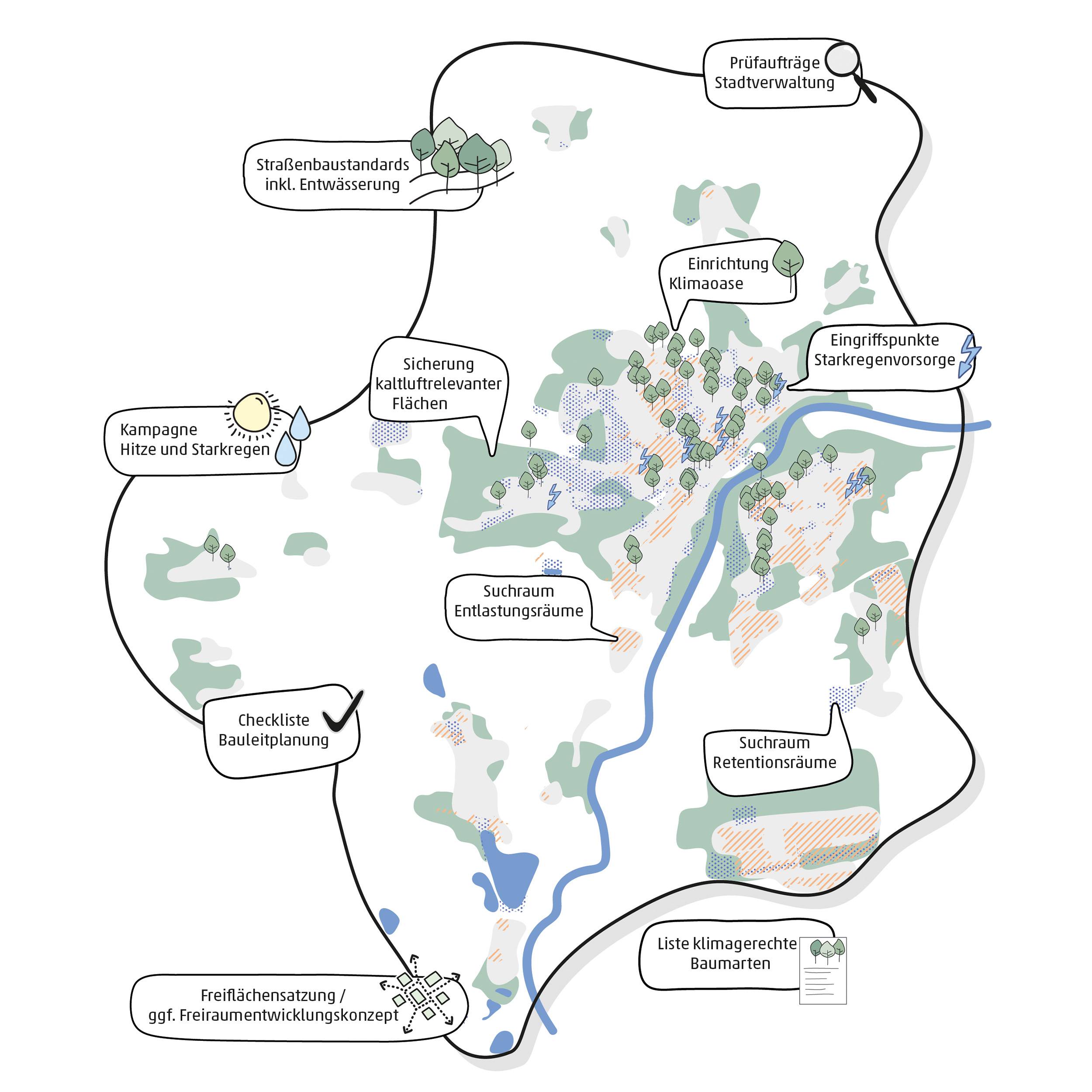 Es werden jeweils Querschnitts-Ansätze formuliert, die das Handlungsfeld Hitze als auch das Handlungsfeld Wasser berücksichtigen.