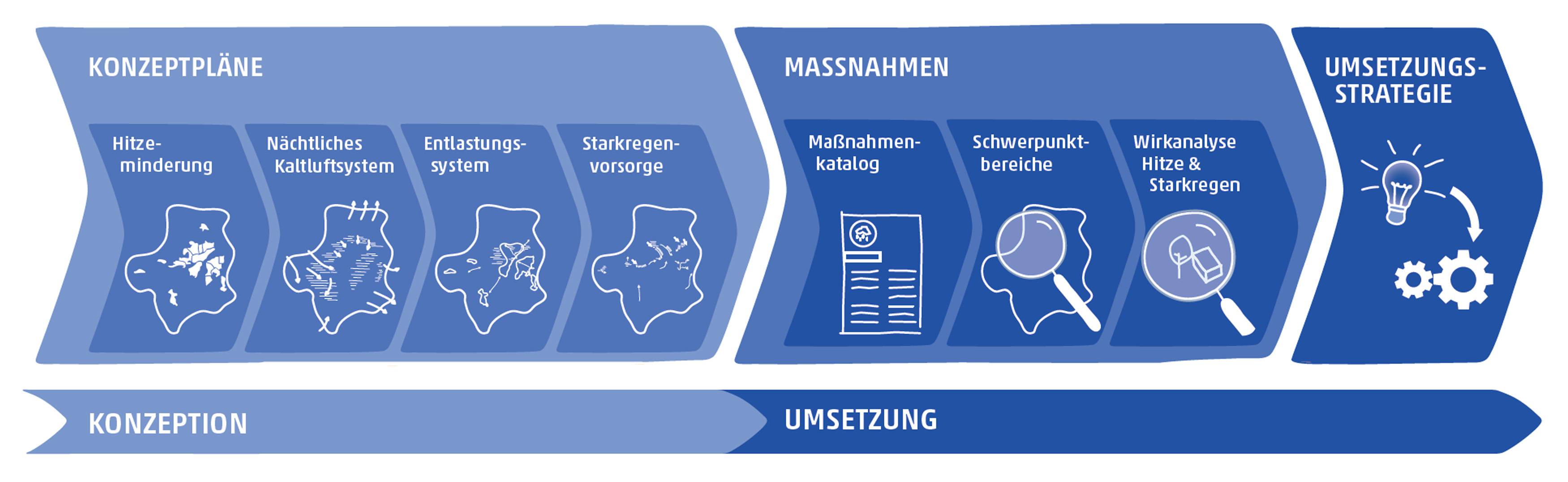 Die Maßnahmenansätze werden hinsichtlich ihrer Anwendbarkeit an konkreten Stadträumen getestet. So wird aufgezeigt, wie das Konzept in vielen ohnehin anstehenden Planungen angewendet und umgesetzt, gewissermaßen angedockt werden kann.