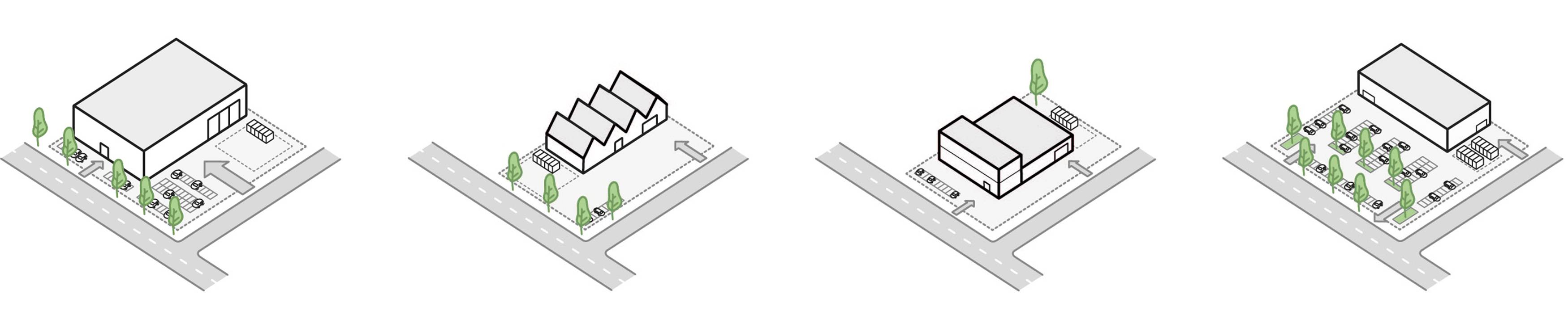 Im Rahmen der Untersuchung von Nachverdichtungspotenzialen in „klassischen“ Gewerbegebieten, zu denen auch das Untersuchungsgebiet in Fellbach gezählt werden kann, können einige charakteristische Typologien identifiziert werden. Die Einteilung in Typologien dient dabei vor allem dazu, die Übertragbarkeit der konkreten Fallbeispiele auf andere räumliche Situationen und Gegebenheiten zu gewährleisten. Die Einteilung orientiert sich sowohl an der baulichen Typologie des Bestands als auch an Parametern wie der Nutzung, den Eigentumsverhältnissen, dem Betreibermodell oder dem Grad der Öffentlichkeit.