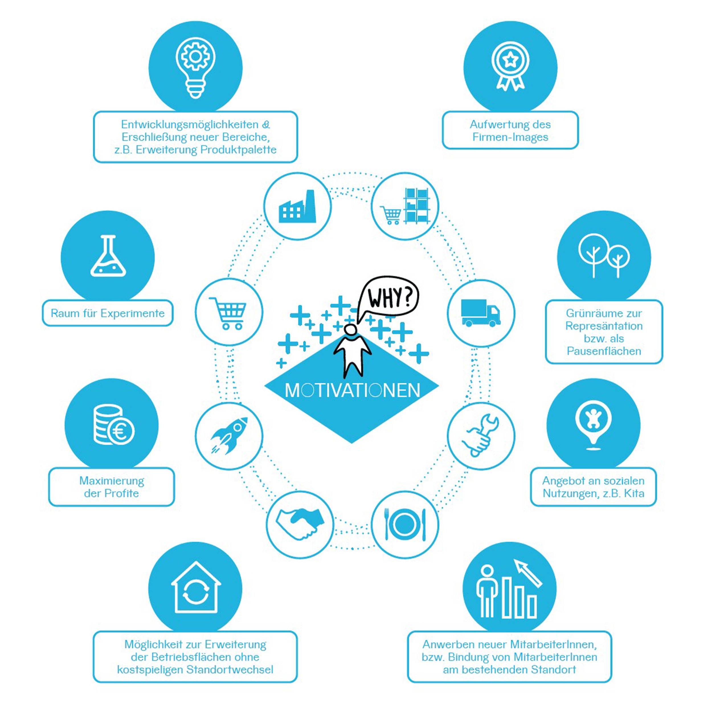Die baulichen Möglichkeiten verdeutlichen, welchen Aufwand eine Entwicklung im Bestand erfordert, weshalb die Motivation der Akteur:innen die entscheidende Rolle bei der Umsetzung spielt. Die Anreize für eine Bestandsentwicklung kann von einer Maximierung der Profite über die Aufwertung des Firmen-Images oder der Erweiterung der Betriebsfläche ohne Standortwechsel reichen.