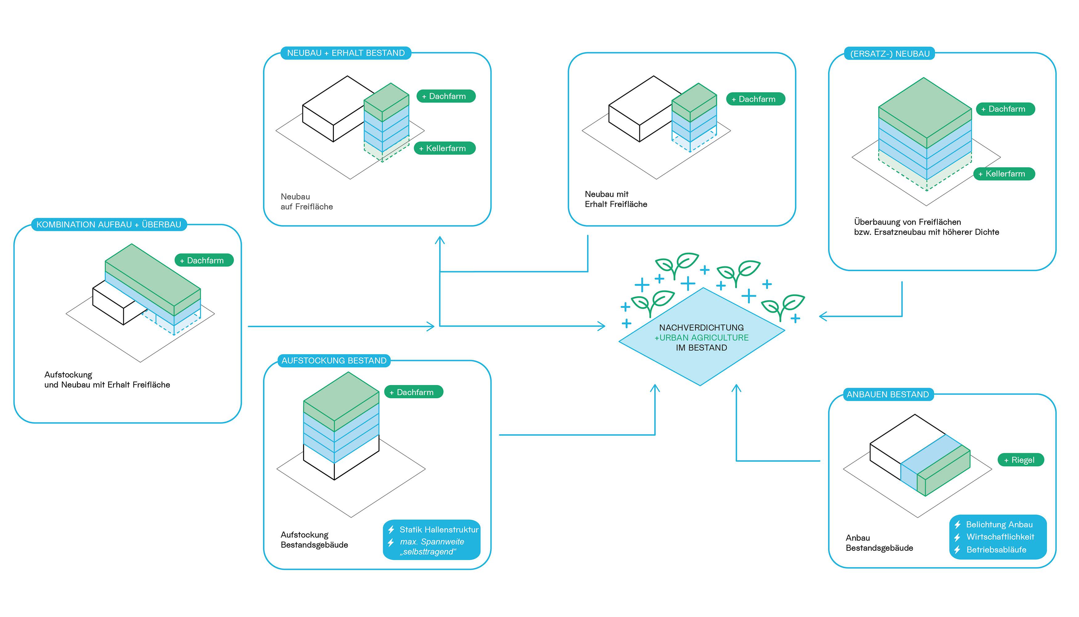 Die Implementierung von urban agriculture steht in Zusammenhang mit der baulichen Weiterentwicklung, da die verschiedenen Gebäudekubaturen unterschiedliche Voraussetzungen für die urbane Landwirtschaft bieten und als Add-on zur Nachverdichtung zu betrachten sind. Einige Parameter, wie die Form des Grundrisses, eine Mindestgröße für die Anbaufläche sowie die Nutzung von Abwärme zugunsten von Synergien beider Nutzungen bilden die Basis für eine erfolgreiche Umsetzung.