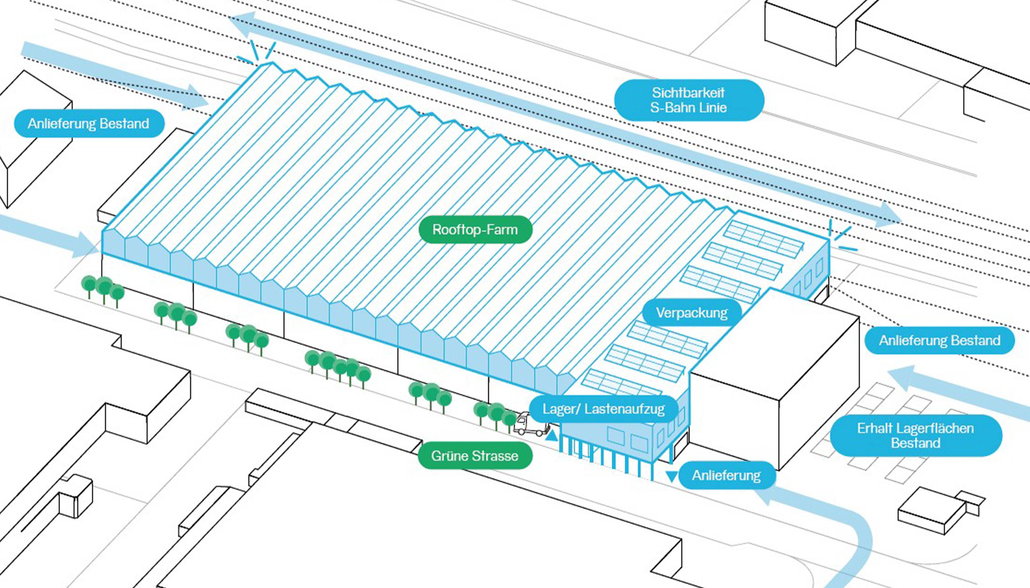 Der Kerngedanke des Zukunftsszenarios ist das Nutzen der großen Gebäudeoberfläche, insbesondere die Nutzung des Daches, da diese Typologie eine wertvolle Flächenressource darstellt. Die Produktionshalle bietet aufgrund ihrer großformatigen Dachfläche gute Voraussetzungen für eine Rooftop-Farm. Dennoch ist die bestehende Halle ursprünglich als eingeschossige Gebäudehülle konzipiert worden. Daher sind die Tragwerke bereits weitestgehend ausgereizt und können voraussichtlich nur geringfügige zusätzliche Lasten aufnehmen, weshalb für die Dachflächennutzung ein eigenes Tragewerk konzipiert werden muss. Die Implementierung von High-Tech-Gewächshäuser stellen große Investitionen dar, eine Wirtschaftlichkeit ist erst ab einer Grundfläche von mindestens 10.000m² gegeben. Durch die bauliche Transformation können die bestehende und neue Nutzung in Synergie gemeinsam agieren oder als separate Nutzungen und Eigentumsstrukturen funktionieren.