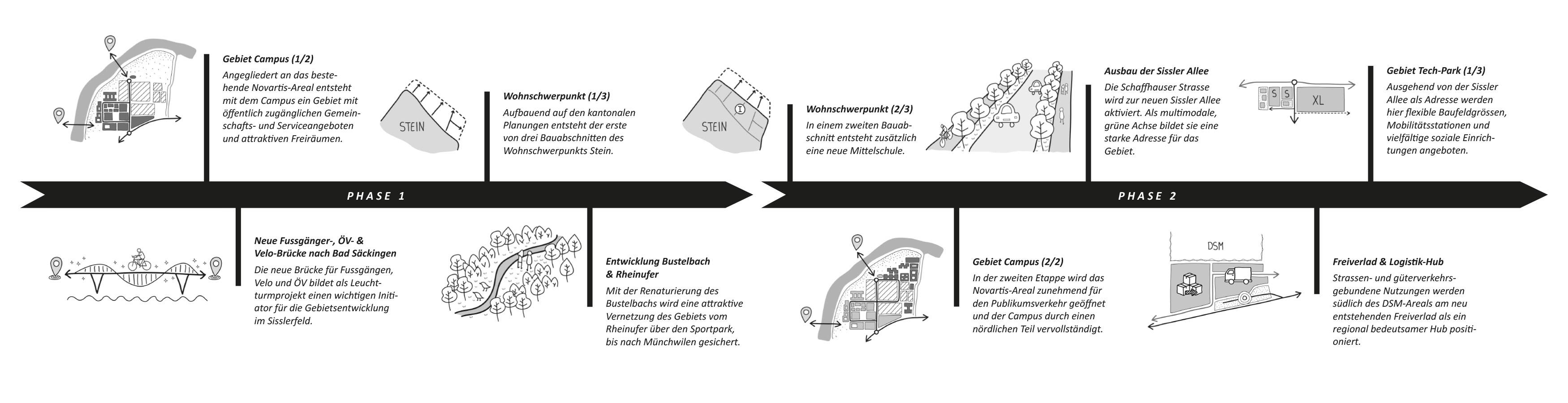 Die Entwicklung des Sisslerfelds erfolgt in mehreren, flexibel anpassbaren Etappen, wobei insbesondere in den frühen Phasen Zwischen- und Pioniernutzungen mitgedacht werden. Ein erster Impuls ist die Entwicklung eines Campusbereichs mit neuer ÖV- und Langsamverkehrsbrücke nach Bad Säckingen als prägendes Wahrzeichen und Schritt zur Öffnung des Novartis-Areals. Parallel dazu werden das Rhein- und Bustelbachufer renaturiert und erste Wohn- und Freiraumbezüge geschaffen.