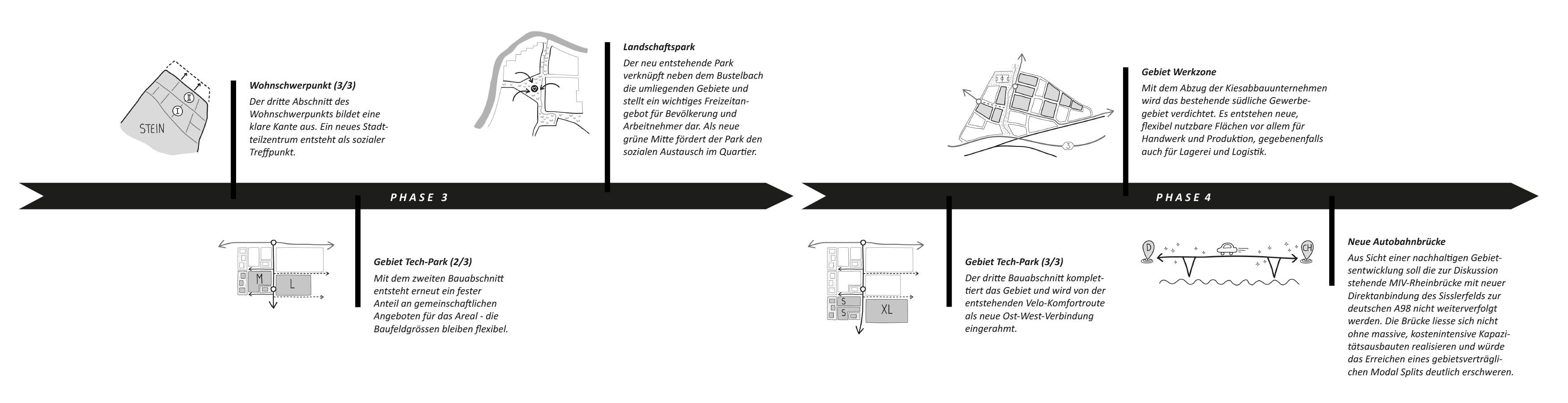 In den folgenden Etappen werden der Campus und das Novartis-Areal weiterentwickelt, der Wohnschwerpunkt ergänzt sowie der Tech-Park, die Sissler Allee und logistikbezogene Nutzungen schrittweise realisiert. Die abschliessenden Phasen dienen der Vervollständigung des Wohn- und Arbeitsangebots, der Entwicklung eines inneren Landschaftsparks und der Neuordnung des südlichen Teilgebiets mit der letzten Ausbaustufe des Tech-Parks.