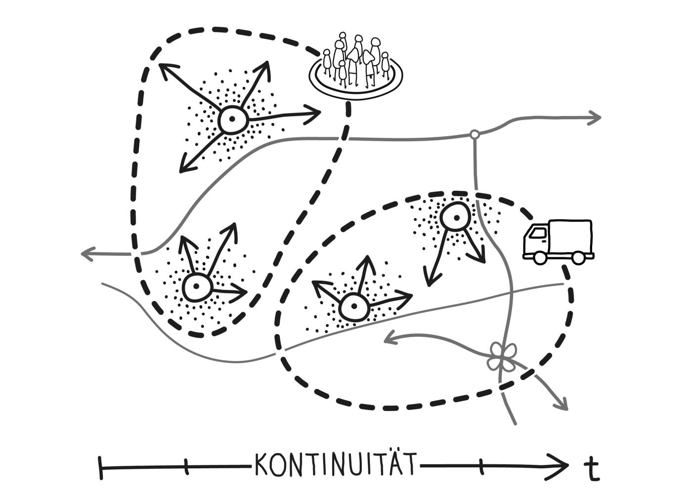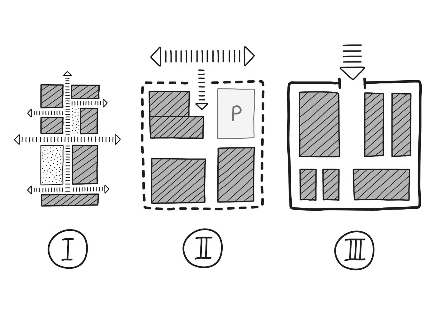 Die drei grossen, bereits im Gebiet ansässigen Unternehmen, und das bestehende Wohngebiet Stein werden in diesem Szenario als Keimzellen interpretiert. Zukünftige Entwicklungen entstehen im direkten Umfeld dieser Zellen, so dass diese bedarfsabhängig ausgebaut werden können und zu keinem „unfertige“ Zustände existieren.