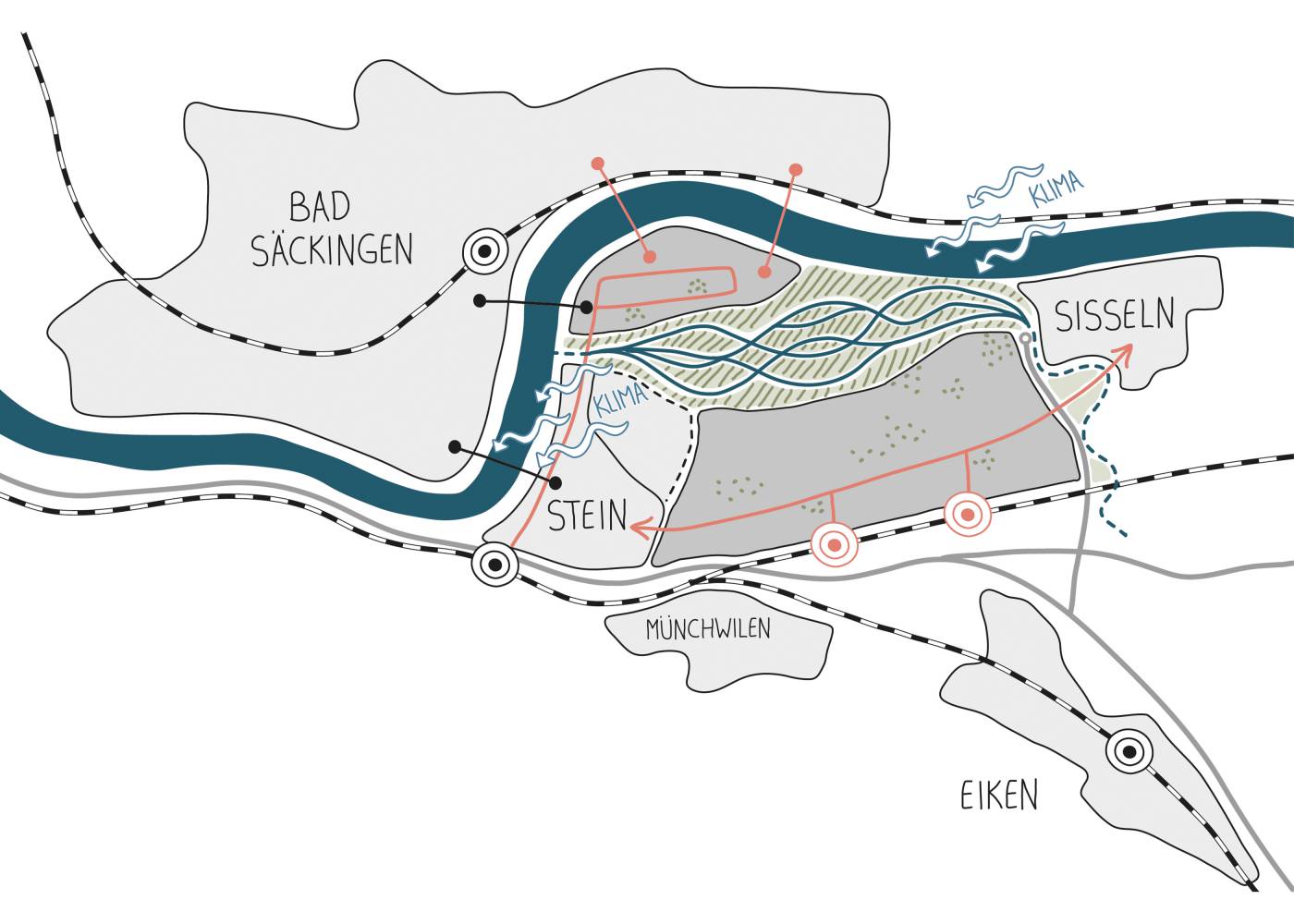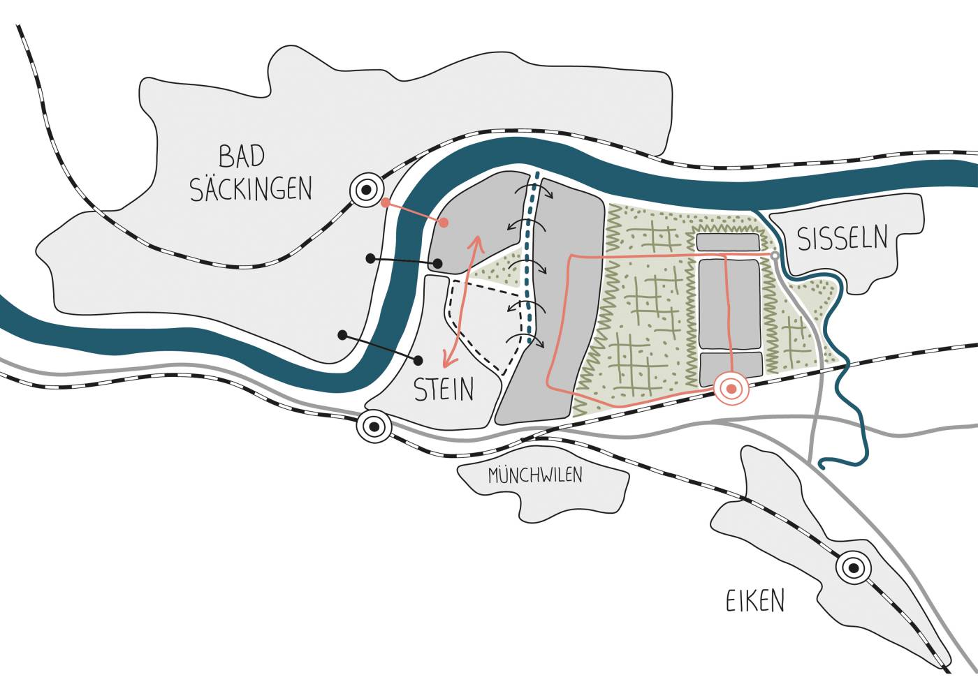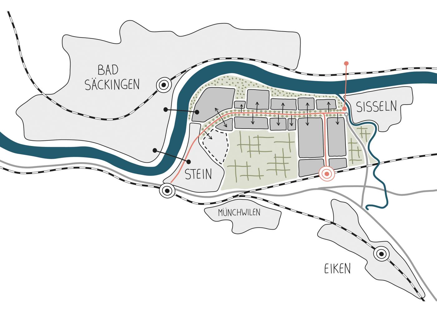 Durch die Stärkung der Beziehung zu Bad Säckingen entsteht im Westen ein kompaktes, hochfrequentiertes Arbeitsplatzgebiet mit urbanen Räumen, das vor allem von einer hohen Güteklasse des ÖV-Netzes profitiert. Strassen- und güterverkehrsgebundene Nutzungen werden im Osten positioniert.