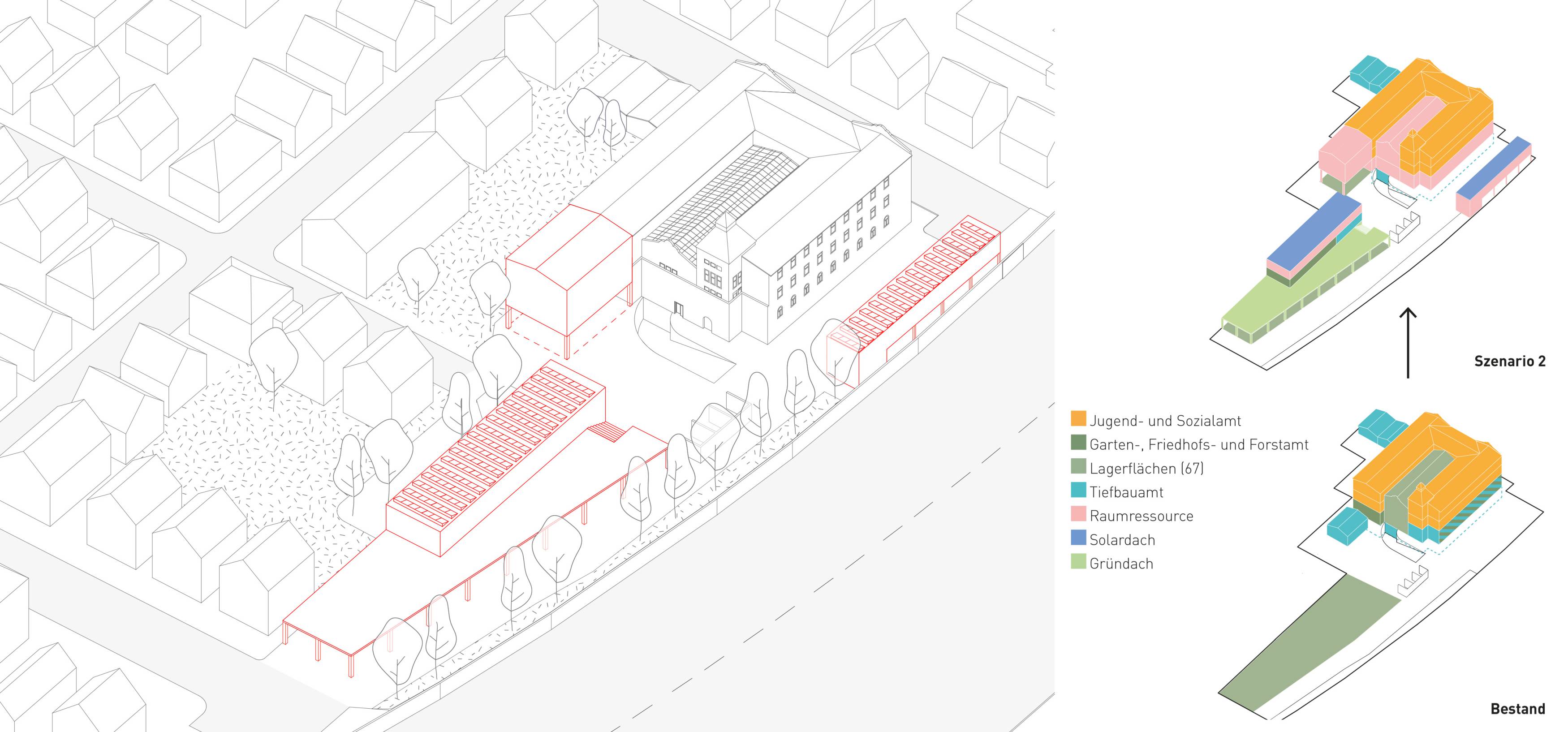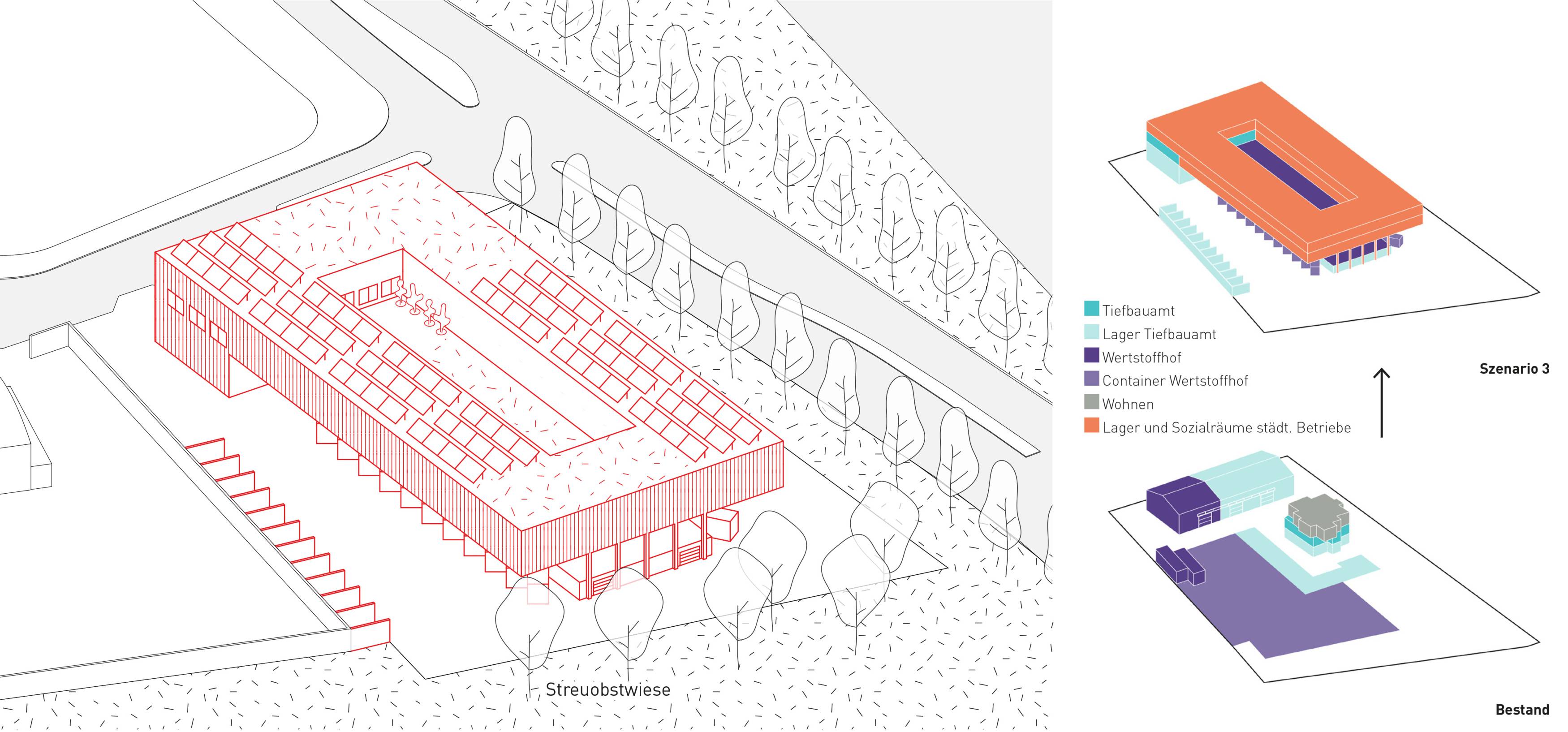 Dieses Szenario zeigt die maximale Dichte und maximalen Flächengewinn auf dem Grundstück. Das Raumprogramm für AWS und Tiefbauamt wird parallel zur Straße angeordnet, der Wertstoffhof zweigeschossig überbaut. Es entstehen flexible Flächen für Lager, Archive, Büros und Sozialräume. Der geschützte Innenhof dient als hochwertiger Pausenbereich, die Dachflächen sind für PV-Anlagen nutzbar.