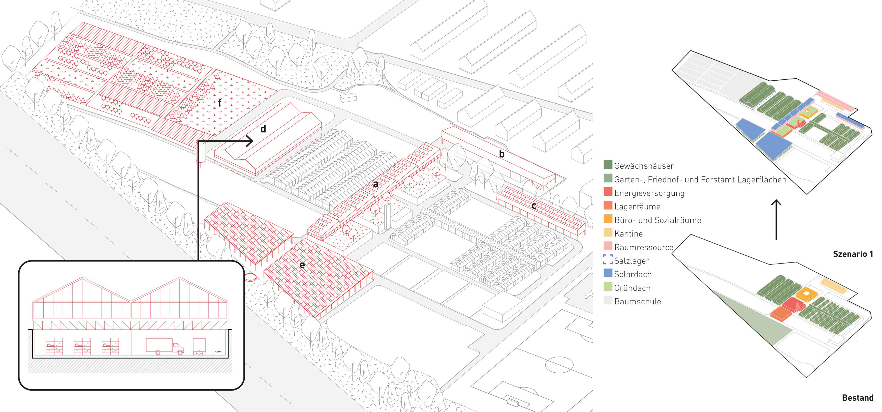 Das Szenario ergänzt die drei Pavillons mit einer eingeschossigen Aufstockung (a), die begrünte Dachflächen als Freiraum und Regenrückhalt erschließt. Das neue Gebäude bietet Platz für Sozial- und Ausbildungsräume der Stadtgärtnerei, auf dem Sheddach ist eine PV-Anlage vorgesehen. Weitere Bausteine sind die aufgestockte Kantine (b), überbaute Lager-/Parkflächen im Nordosten (c), ein neues Gewächshaus mit darunterliegendem Lagerbereich (d) sowie überdachte Lagerflächen im Süden (e) mit PV- und Regenwassernutzung. Im Westen (f) bietet eine Freifläche Potenzial für gärtnerische Ausbildungsnutzung.