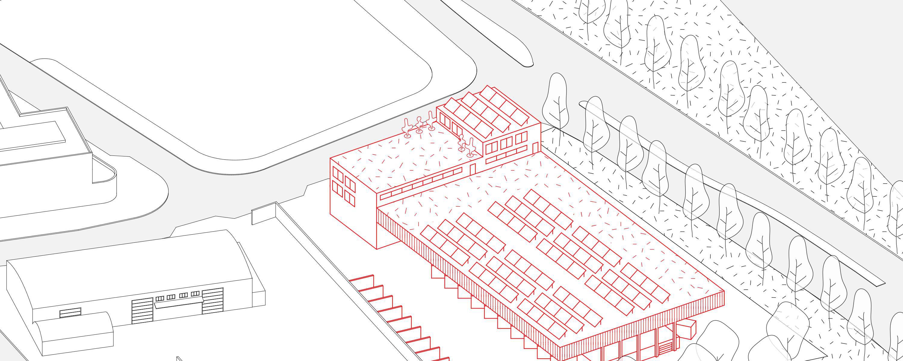 Der Entwurf „Riegel“ nutzt die nordöstliche Hoffläche für einen zweigeschossigen Bau mit wettergeschützten Lagerflächen im EG und Büro- sowie Sozialräumen (800 m² BGF) im OG. Eine Terrasse entsteht auf dem Flachdach. Ergänzend sind ein Anbau mit überdachtem Lager und flexibel nutzbarem Raum sowie eine mögliche Überbauung der südwestlichen Parkplätze vorgesehen.